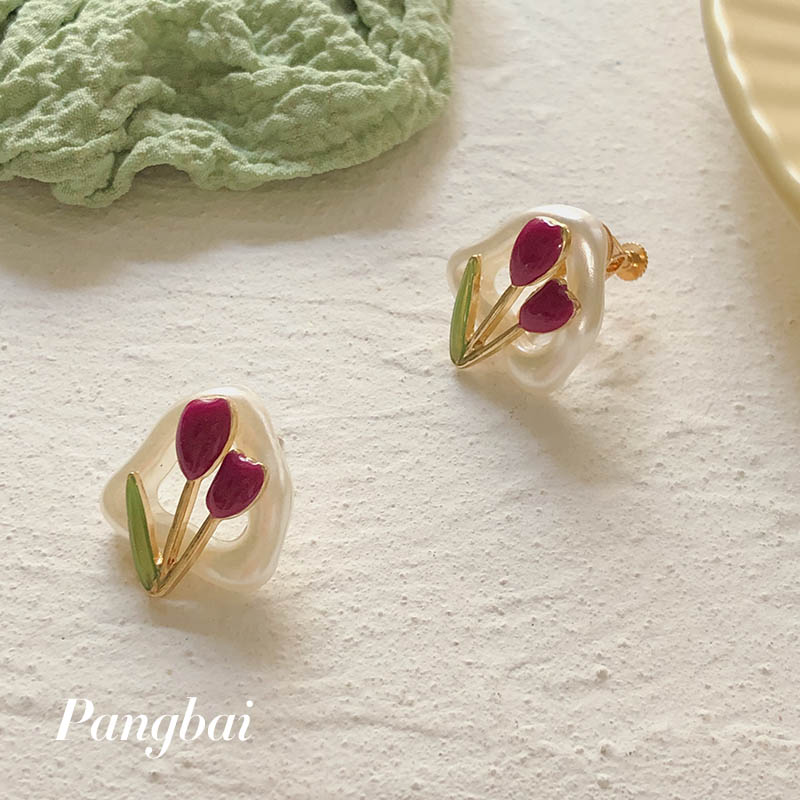 原创设计郁金香花卉耳钉复古油画感温柔气质法式珍珠花朵耳环耳夹热门设计联盟服务商