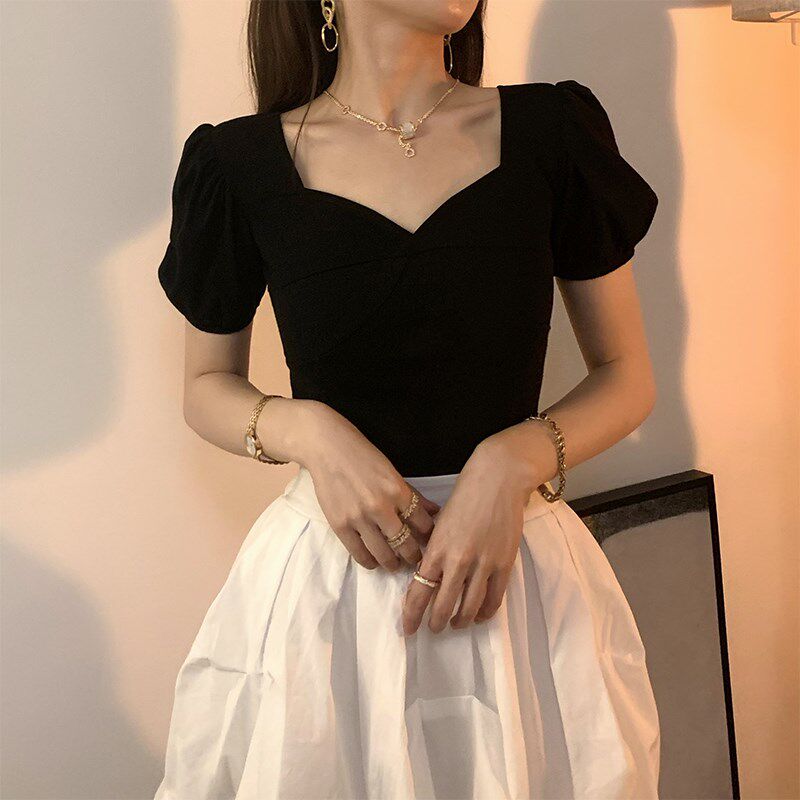 许菇凉服饰法式复古黑色方领t恤女装夏季薄款短袖泡泡袖v领上衣设热门设计联盟服务商
